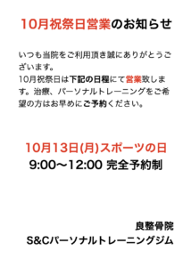 いつも当ジムをご利用頂きありがとうございます。10月13日(月)スポーツの日は9:00〜12:00の完全予約制にて営業致します。治療、パーソナルトレーニングをご希望の方はお早めにご予約ください。